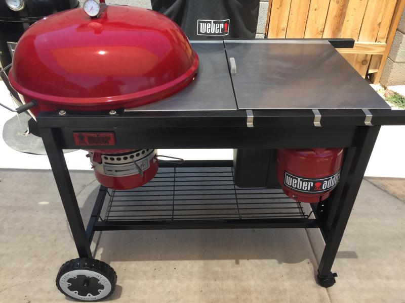 The weber 22 performer deluxe grill has color options and includes electronic ignition large work table lcd cook timer and charcoal storage bin.
